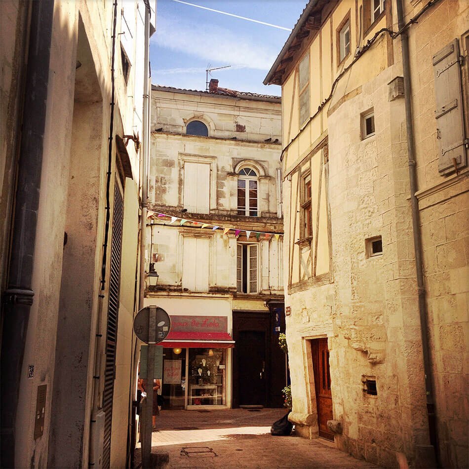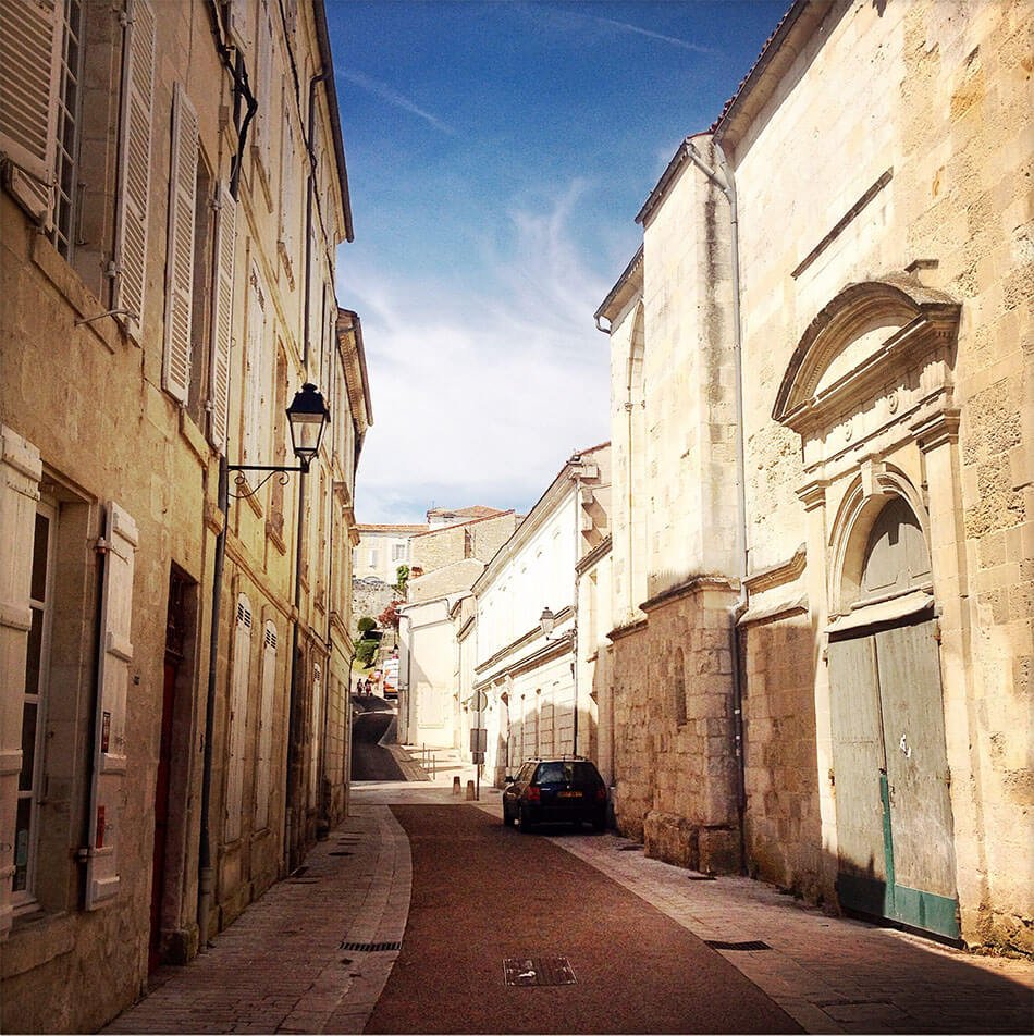 Point de départ : Saintes. J’y ai découvert des rues chaleureuses, un patrimoine intéressant et même des vestiges romains. Arrêtons-nous un instant dans cette ville agréable. En fait, ce que j’ai aimé, ce sont ses ruelles, ses murs un peu jaunis qui font écho à la chaleur des après-midis et rappellent que Saintes, c’est le début du sud. Ici aussi, les maisons ont des toits en petites tuiles orange, ici aussi, les ruelles et les murs racontent le soleil.