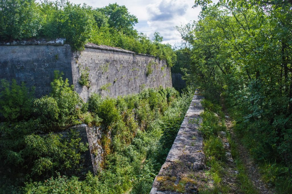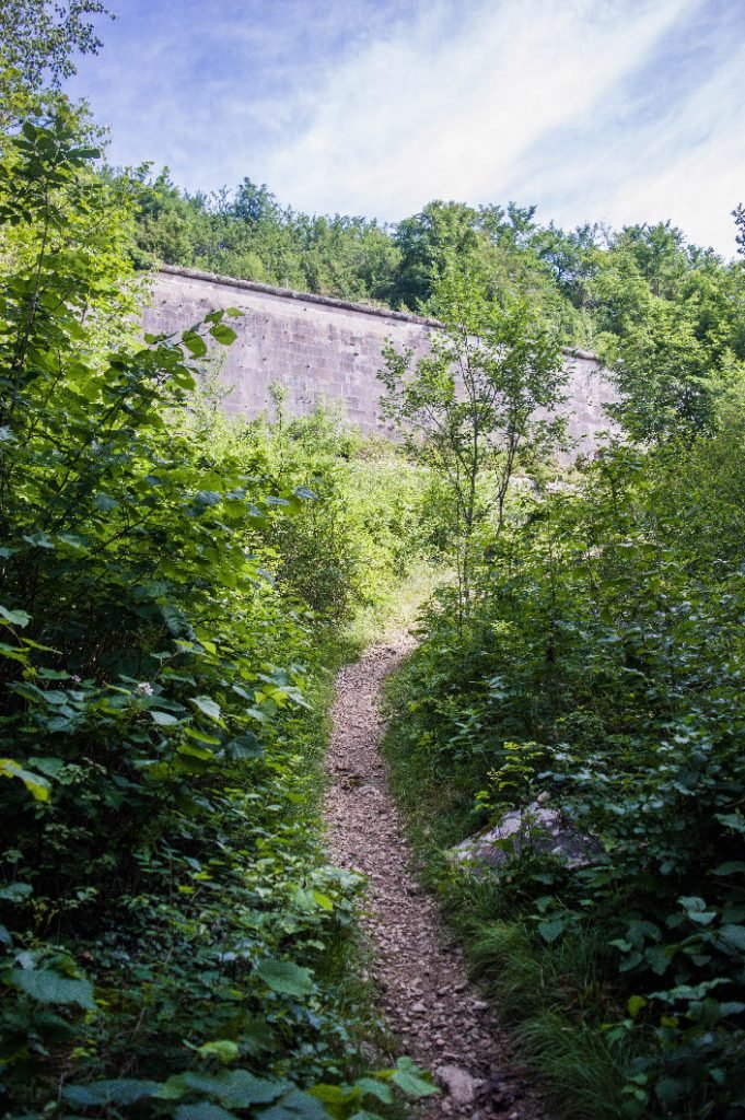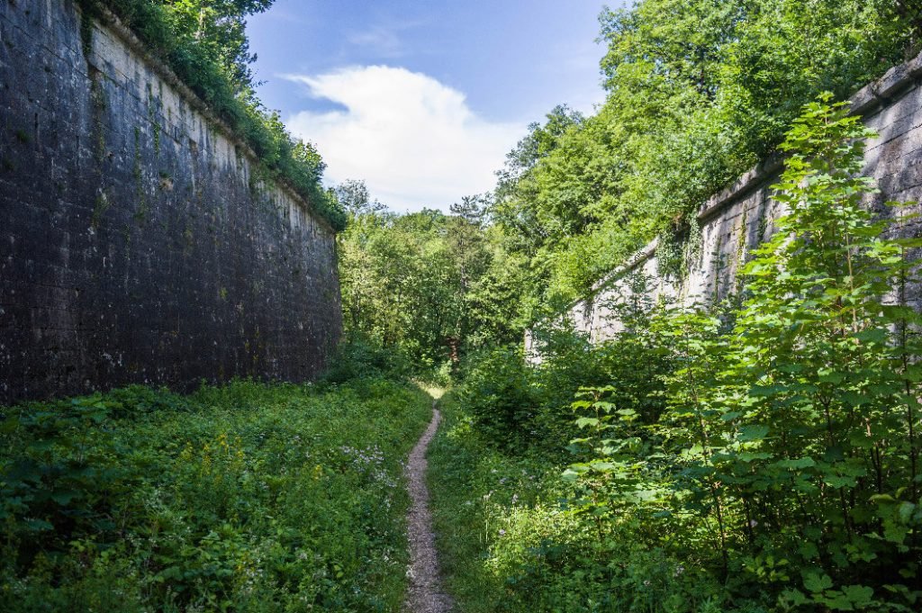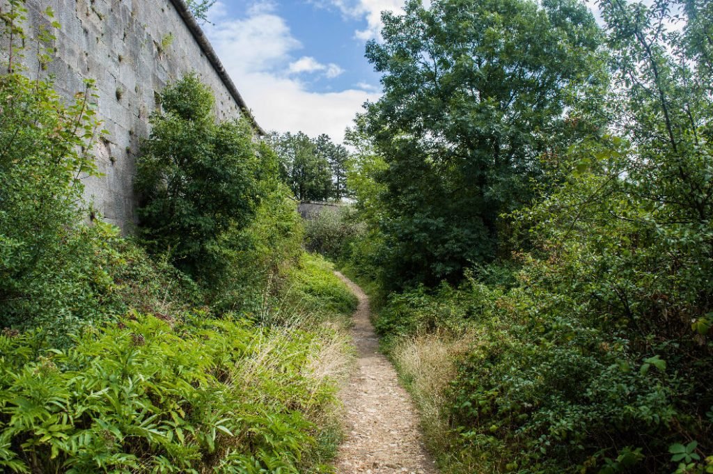 Cette fois-ci, si tu as le temps, tu peux reprendre le chemin le long des glacis et emprunter le chemin de gauche. La végétation y est volontairement laissée sauvage ce qui donne une impression d’être dans un lieu inconnu. Or, c’est un sentier utilisé tous les jours par les randonneurs et les joggeurs. Ce sentier contourne le fort et te ramènes direct au niveau du parking.