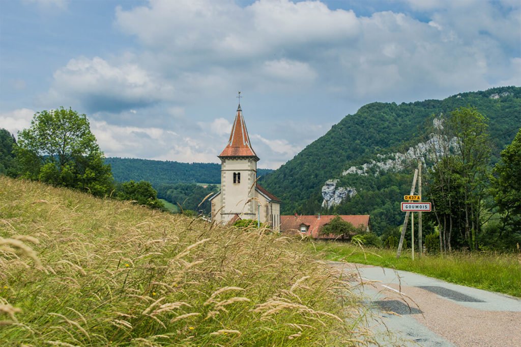 Au terme de près de 50 kilomètres entre deux pays, le Doubs traverse Goumois, un petit village, installé dans un pittoresque décor fait de roches, de plateaux et d’étendues boisées. Il est situé à quelques kilomètres de l’endroit où le Doubs, las de serpenter entre deux pays, bifurque et s’offre une aventure en terres hélvètes, avant de se raviser, après un court séjour chez nos voisins, et de revenir en territoire comtois, pour traverser la région en direction du sud. Et quand on arrive à Goumois, on descend dans la vallée en passant par la corniche, d’où la vue sur la vallée est magnifique.