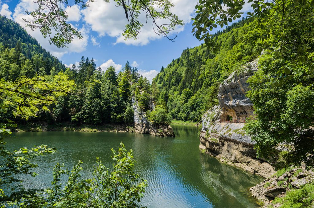 La France partage une frontière de 572 kilomètres avec la Suisse dont 230 rien qu’en Franche-Comté. Alors que dans le sud de la région, ce sont plutôt les hauts plateaux, les combes et les reliefs qui marquent la frontière, à partir de Villers-le-Lac, c’est le Doubs, rivière bien comtoise, qui joue les douaniers et s’improvise frontière. Sur environ 50 kilomètres, la rivière s’élance dans sa belle robe bleue entre les deux pays, en creusant sur son passage une vallée étonnante.
