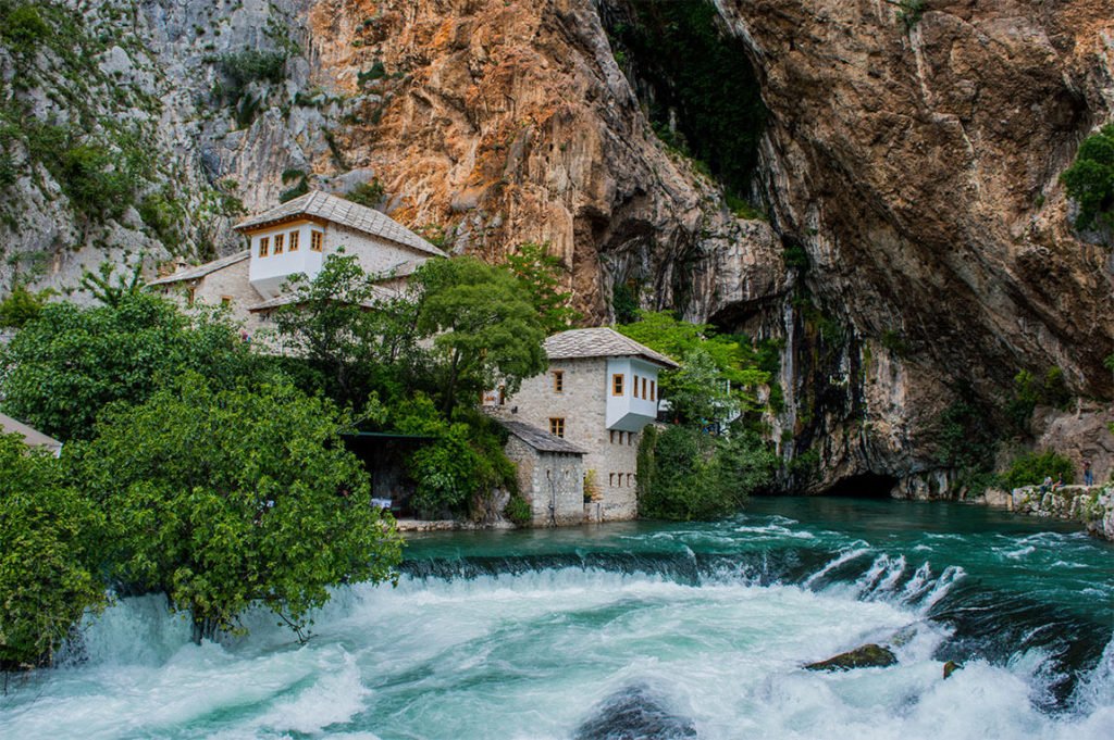Ce qui est surprenant et spectaculaire à Blagaj, c’est la source de la rivière Buna, qui sort des falaises abruptes et imposantes. L’eau y est limpide et bruyante, pleine de vie. Au bord de cette source, juste au dessous des falaises, se tient un tekke. Un tekke, c’est presque l’équivalent musulman d’un couvent et il est essentiellement réservé aux soufis (une branche de l’Islam surtout connue pour ses derviches tourneurs). L’influence ottomane sur la Bosnie-Herzégovie y a laissé de nombreuses empreintes, comme ce mot (venu du turc) et ce type de bâtiment servant de lieu de culte aux derviches tourneurs.