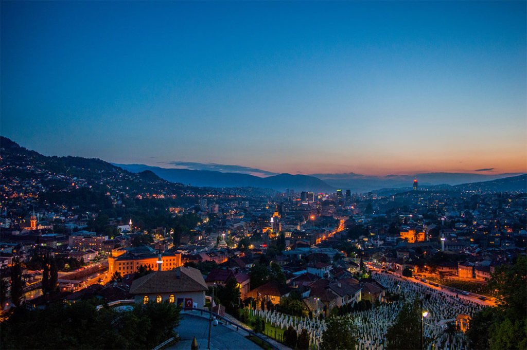 Arrivé à l’aéroport de Sarajevo la nuit tombée, je découvre à travers les vitres de la voiture me ramenant au centre ville les premières images de Sarajevo. Les rues sont animées, les néons de magasins et des restaurants sont colorés. Je distingue les formes des bâtiments, les contours des maisons. J’ai toutes les peines du monde à contenir mon excitation de découvrir la ville.