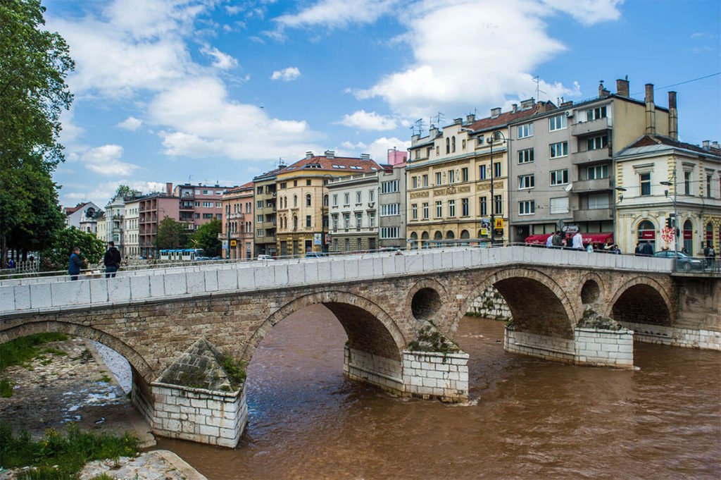 En parlant d’histoire, avez-vous bien retenu vos leçons ? Rappelez-vous, c’est un événement survenu à Sarajevo qui a déclenché la Première Guerre mondiale : un jeune nationaliste serbe, Gavrilo Princip, assassine l’archiduc François-Ferdinand de Habsbourg, héritier du trône de l’Empire d’Autriche-Hongrie. Le pont que l’on voit sur l’image suivante est l’endroit où s’est produit l’attentat, le 28 juin 1914. Le pont porte deux noms : le pont de pierre ou Princip Bridge.