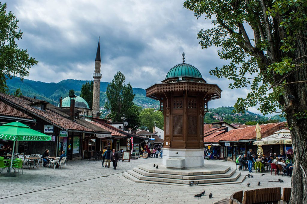 J’ai eu la chance de trouver une location à 6 minutes à pied du centre historique de la ville, appelé Baščaršija (prononcez bach-tcharch-ya). Là, c’est une succession de petites maisons d’architecture ottomane, toutes converties en boutiques, cafés et restaurants avec une place centrale où trône la célèbre fontaine, appelée Sebilj. C’est le point névralgique du Sarajevo historique : vous y trouvez des boutiques d’objets artisanaux (tapis, tasse à café et cafetière par exemple) mais aussi des mosquées et le magnifique Vijećnica (Viyè-tch-nitsa), autrefois bibliothèque nationale.