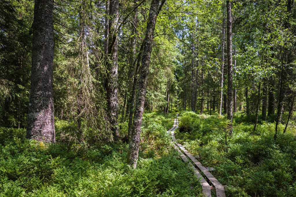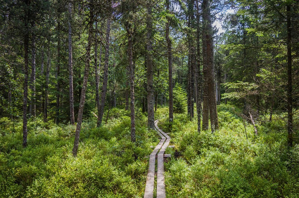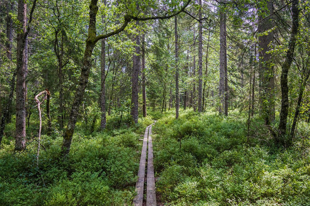 Ensuite, le petit ponton en bois s’engouffre dans un sous-bois merveilleux, au sol tapissé de baies, de mousse et de myrtilles. On entre dans le massif du Forbonnet, un grand massif forestier peuplé de chevreuils, de sangliers et même de lynx, de centaines d’oiseaux, de reptiles et d’amphibiens, le tout dans un cadre qui semble sorti d’un conte.