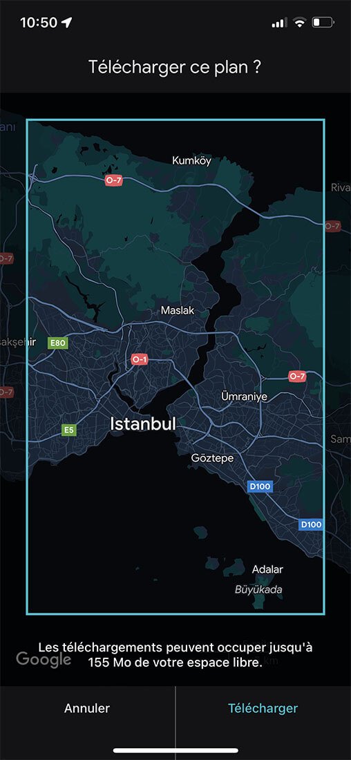 La carte sera disponible pendant 35 jours sur ton téléphone. Sur place, tu n’as plus qu’à lancer Google Maps et le secteur télécharger sera disponible hors connexion. Pour info : si tu as besoin d’un itinéraire, il faudra désactiver le mode avion. Si les « données à l’étranger » sont désactivées, il n’y aura pas de hors forfait et Google Maps fonctionnera tout de même.