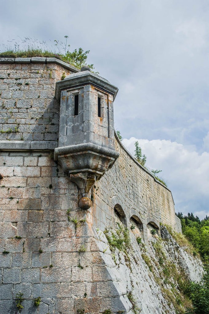 Après le Fort de Joux, je te conseille vivement de monter jusqu’au Fort Malher. Deux chemins sont possibles : le premier part à côté de la bibliothèque (devant l’église) et monte en lacet sur le flanc de la montagne du Larmont. En une trentaine de minutes, sans grand effort, te voilà au Fort Malher. Le deuxième part à côté de l’ancien péage du château, au bord de la route. Ce chemin, c’est un escalier d’environ 230 marches et une petite marche sur un sentier escarpé. Je te conseille vraiment de monter avec le premier chemin et de descendre avec le second.