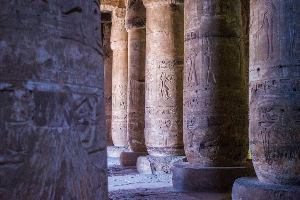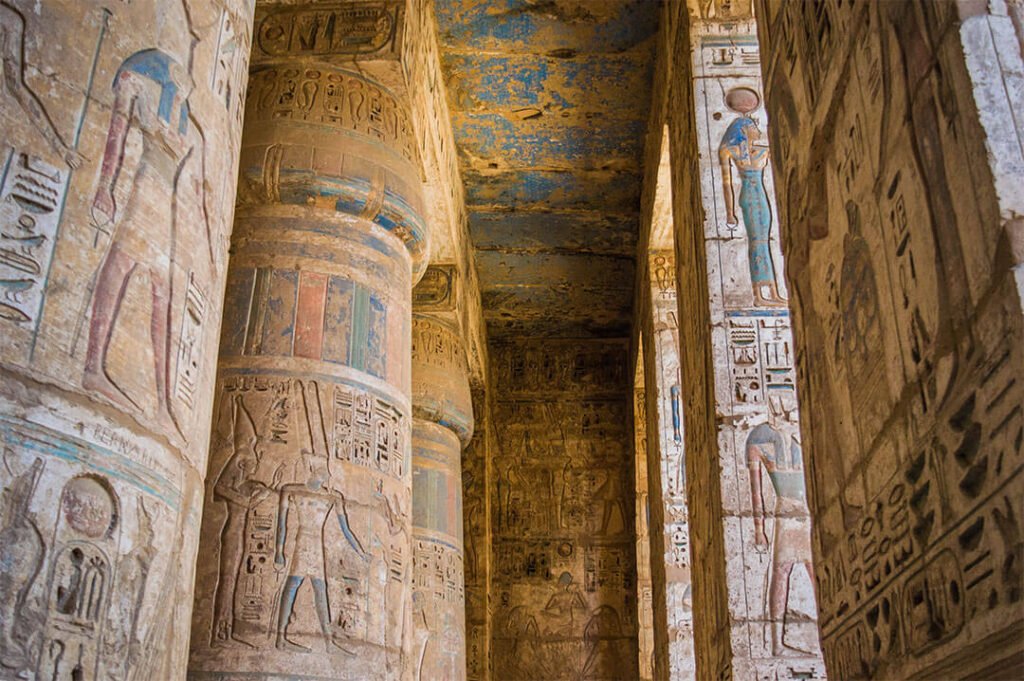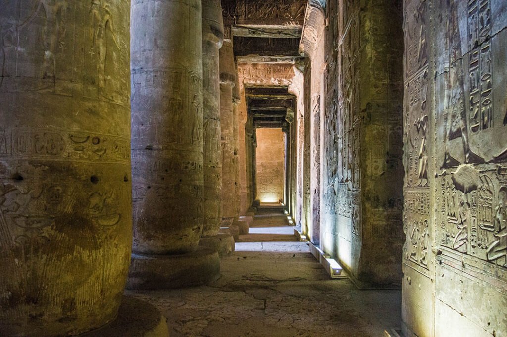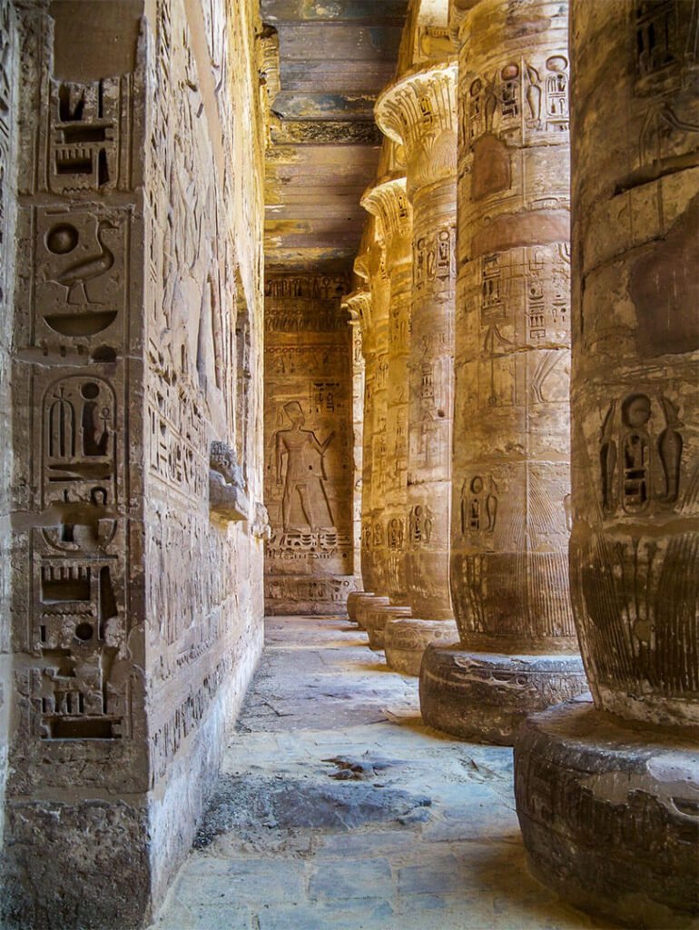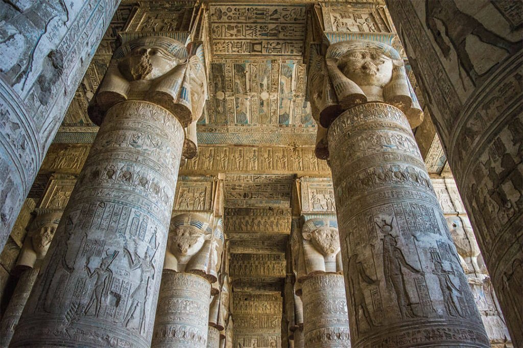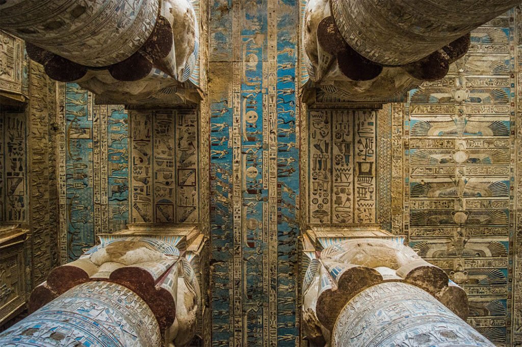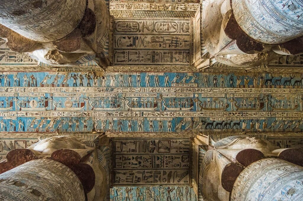 En revenant sur Louxor, arrête-toi visiter le le temple de Denderah, une splendeur dédiée à la déesse Hathor. L’intérêt de ce temple, ce sont ses belles couleurs bleues sur les colonnes et les plafonds, mais c’est aussi un temple qui montre un aspect généralement peu connu et peu représenté dans les temples égyptiens : l’astrologie.