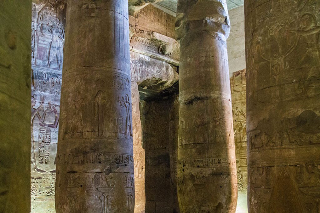 Contrairement aux temples de Louxor et de Karnak qui n’ont plus de plafond, Abydos a toujours la totalité de sa structure. Le fait qu’il ait un plafond et qu’il soit par conséquent couvert, lui confère une atmosphère plus intime, plus mystérieuse et plus fascinante. On a davantage l’impression d’un voyage dans le temps, au cœur d’un temple préservé plutôt que dans des ruines, d’autant que les fresques et les bas-reliefs prennent une toute autre dimension avec les jeux d’ombre et de lumière.