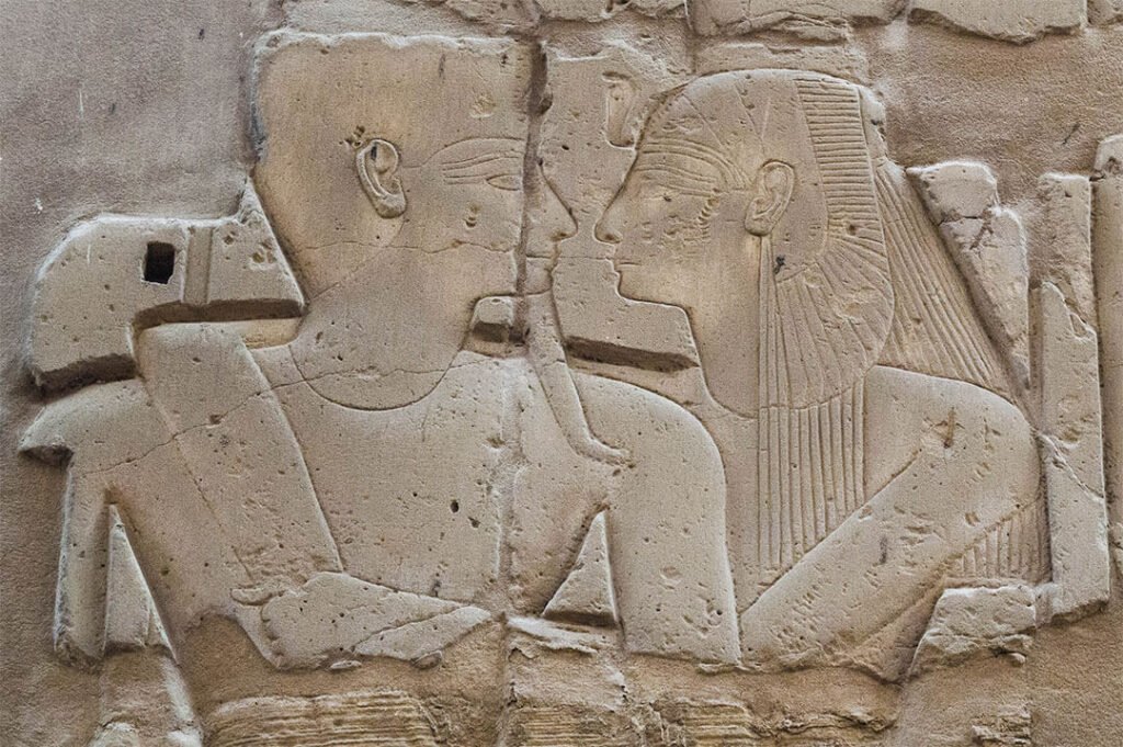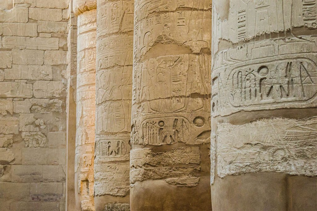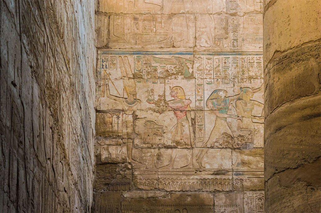 Sur les murs du temple, c’est une succession d’histoires et de récits en tout genre : scènes d’offrande, scènes familiale, scènes de la mythologique mais aussi scènes de guerre, notamment par Ramsès II. Le grand pharaon était un bâtisseur mais il voulait également apparaître comme un grand guerrier. À certains endroits, les bas-reliefs ont gardé leurs couleurs d’origine. On passerait des heures à Karnak à explorer les moindres recoins de ce temple magnifique.