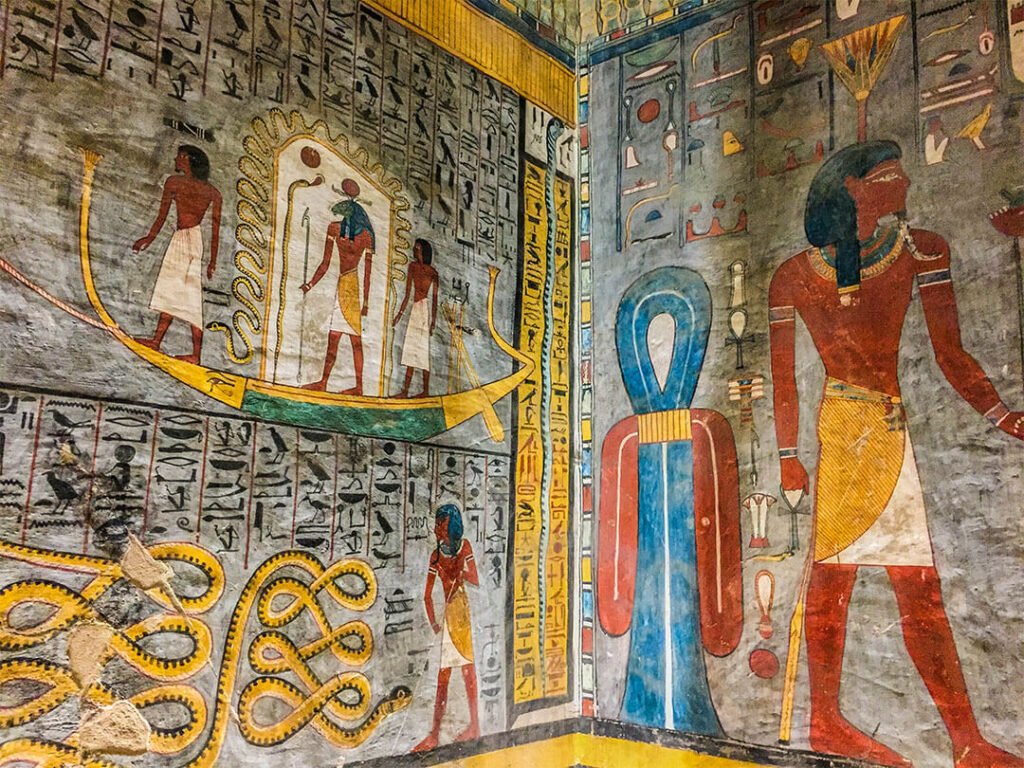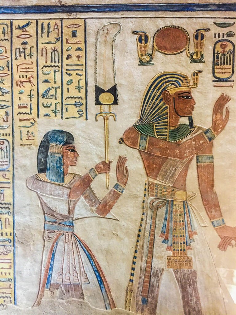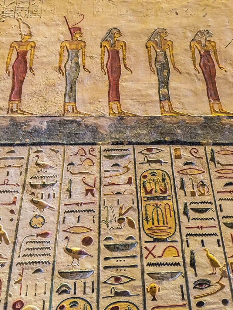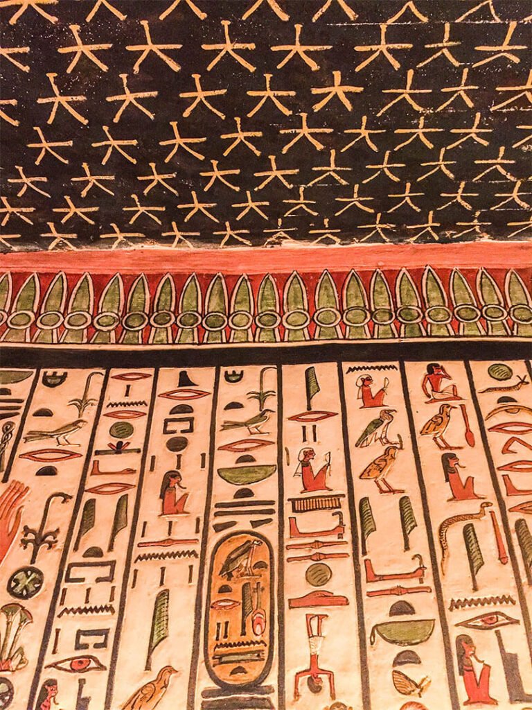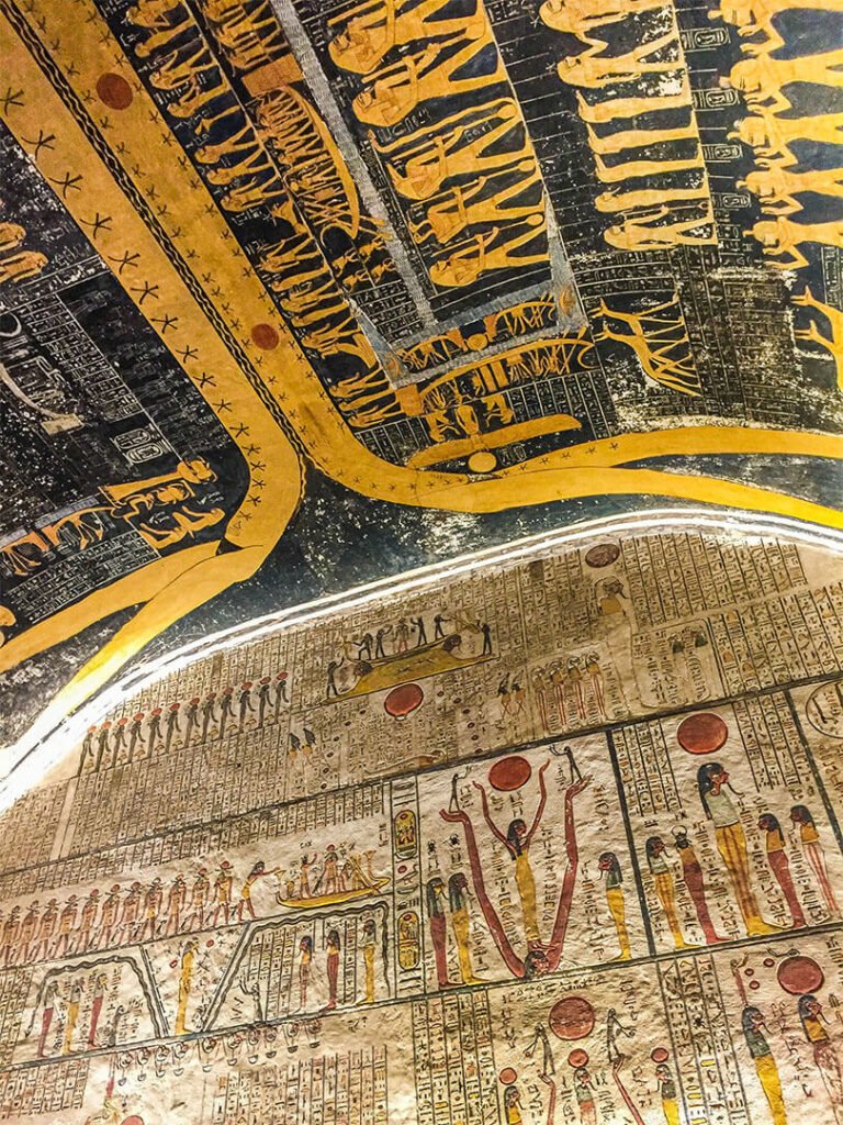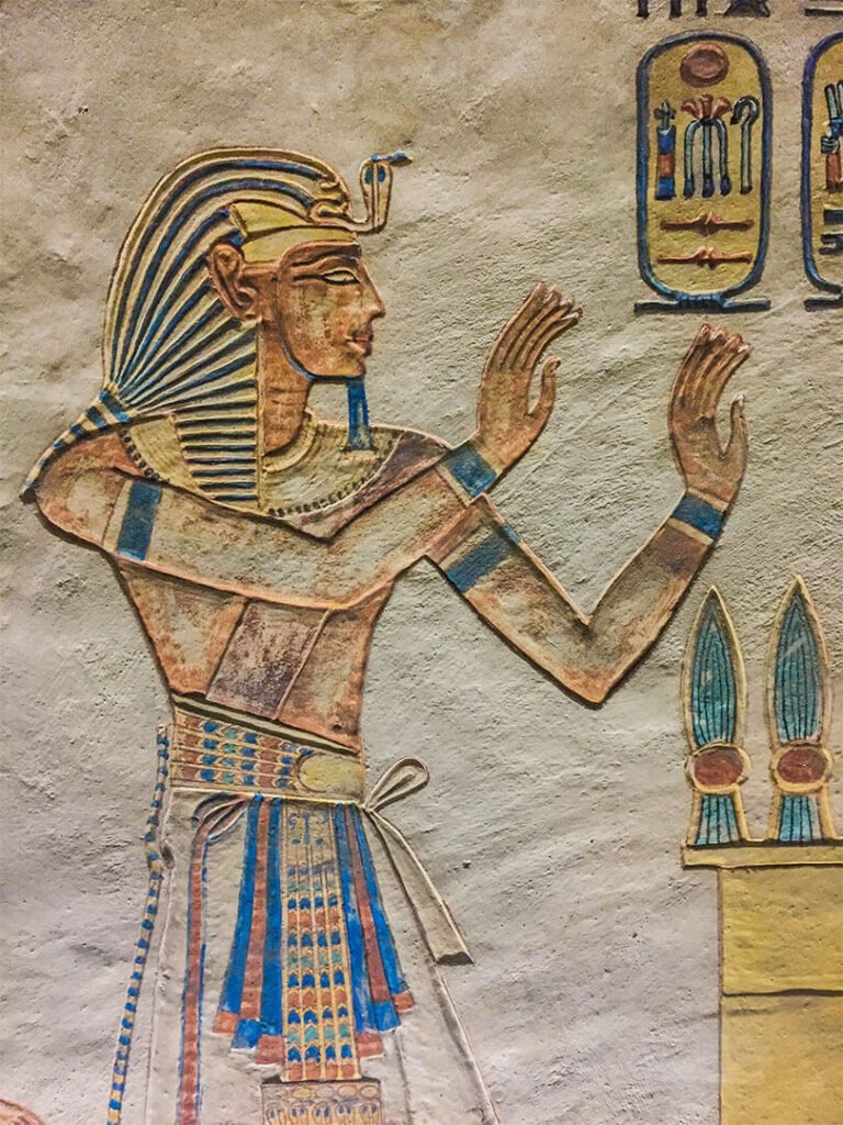 On pourrait visiter par exemple la tombe de Toutankhamon sauf que la totalité du mobilier funéraire (qui a fait sa renommée) se trouve au Musée du Caire et, le pharaon étant mort jeune après seulement 9 ans de règne, les ouvriers n’ont pas eu le temps de décorer sa tombe : les murs sont donc nus, sans aucune fresque, aucune couleur. Mieux vaut prendre le temps de visiter d’autres tombes aux décors remarquables.