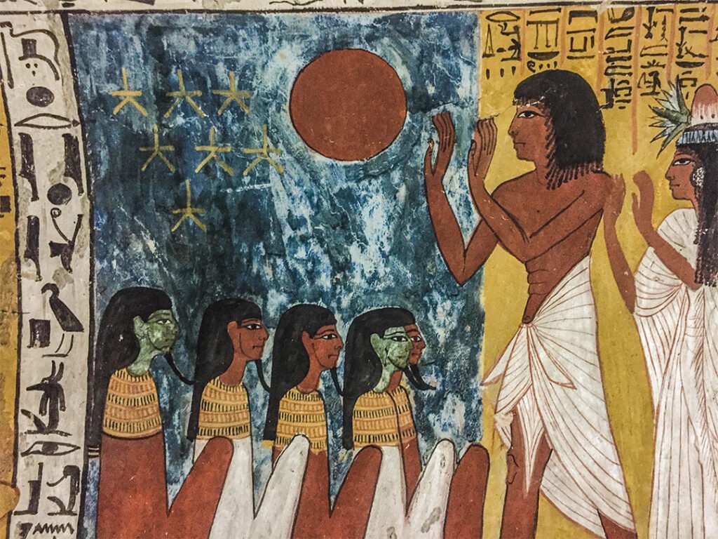 Les anciens Égyptiens représentent régulièrement le cycle de la journée et de la nuit sous les traits de la déesse Nout, courbée en forme de U, qui symbolise le cycle solaire. Mais plus rares sont les représentations d’astronomie. Les Égyptiens représentaient l’univers selon leurs croyances et leurs mythes. Avec l’arrivée des Grecs et des Romains, apparaît également l’astronomie avec l’observation des planètes, puis l’astrologie. Les Grecs introduisent d’ailleurs en Égypte les constellations du zodiaque, nos fameux signes astrologiques, hérités des Babyloniens qui sont les premiers à diviser l’année en douze parties égales.
