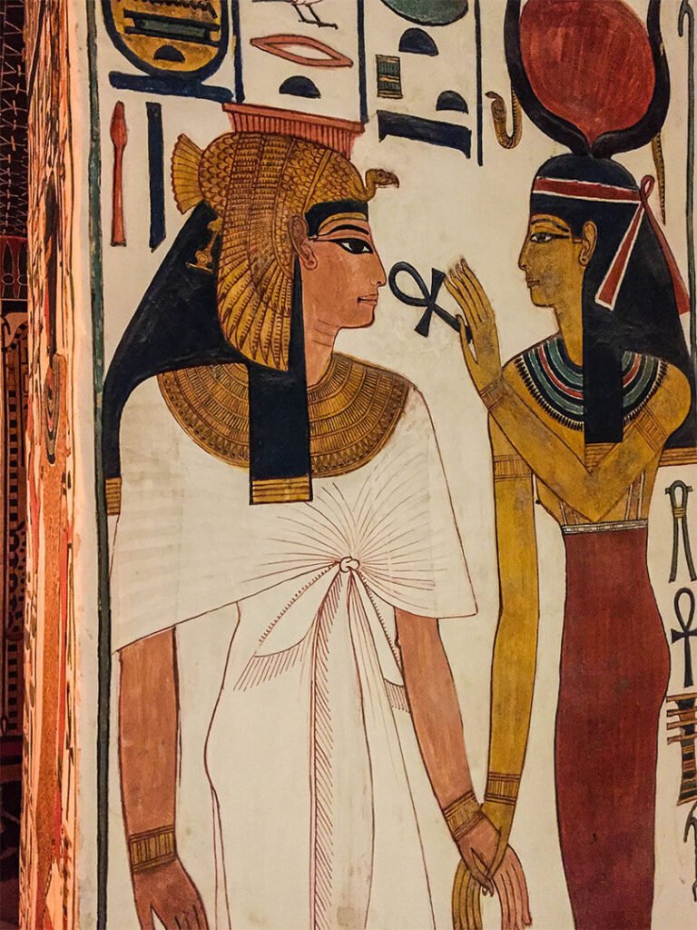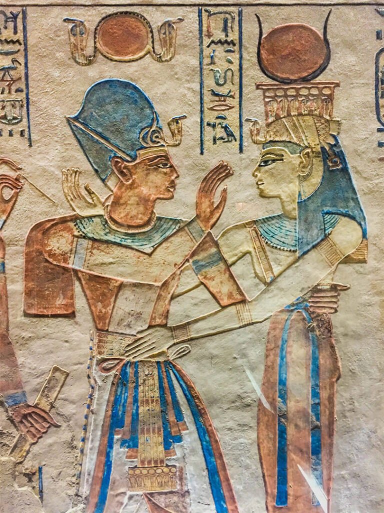 Les épouses royales ne se faisaient jamais enterrer avec leurs époux, d’ailleurs les enfants non plus. Les tombes sont donc dans deux vallées distinctes. Sur les décorations, on y voit l’épouse, le pharaon et les enfants que le souverain introduit auprès des dieux. Bon, les épouses ne sont quand même pas si souvent représentées.