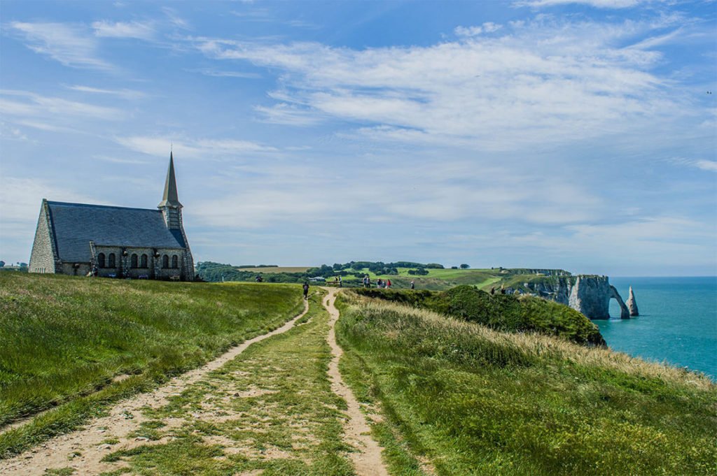 Pas besoin de fournir un gros effort pour accéder au-dessus, la montée se fait relativement rapidement. Au sommet, tu rejoins le chemin de randonnée qui relie Étretat à Fécamp via Yport. Tentante échappée ! Une prochaine fois, peut-être, j’emprunterai le sentier et longerai les falaises pour retrouver la belle Fécamp. La vue est tellement belle vue d’en haut ! J’adore le panorama tellement photogénique des falaises, de la mer et de la petite chapelle Notre-Dame de la Garde qui semble veiller sur la ville et sa côte.